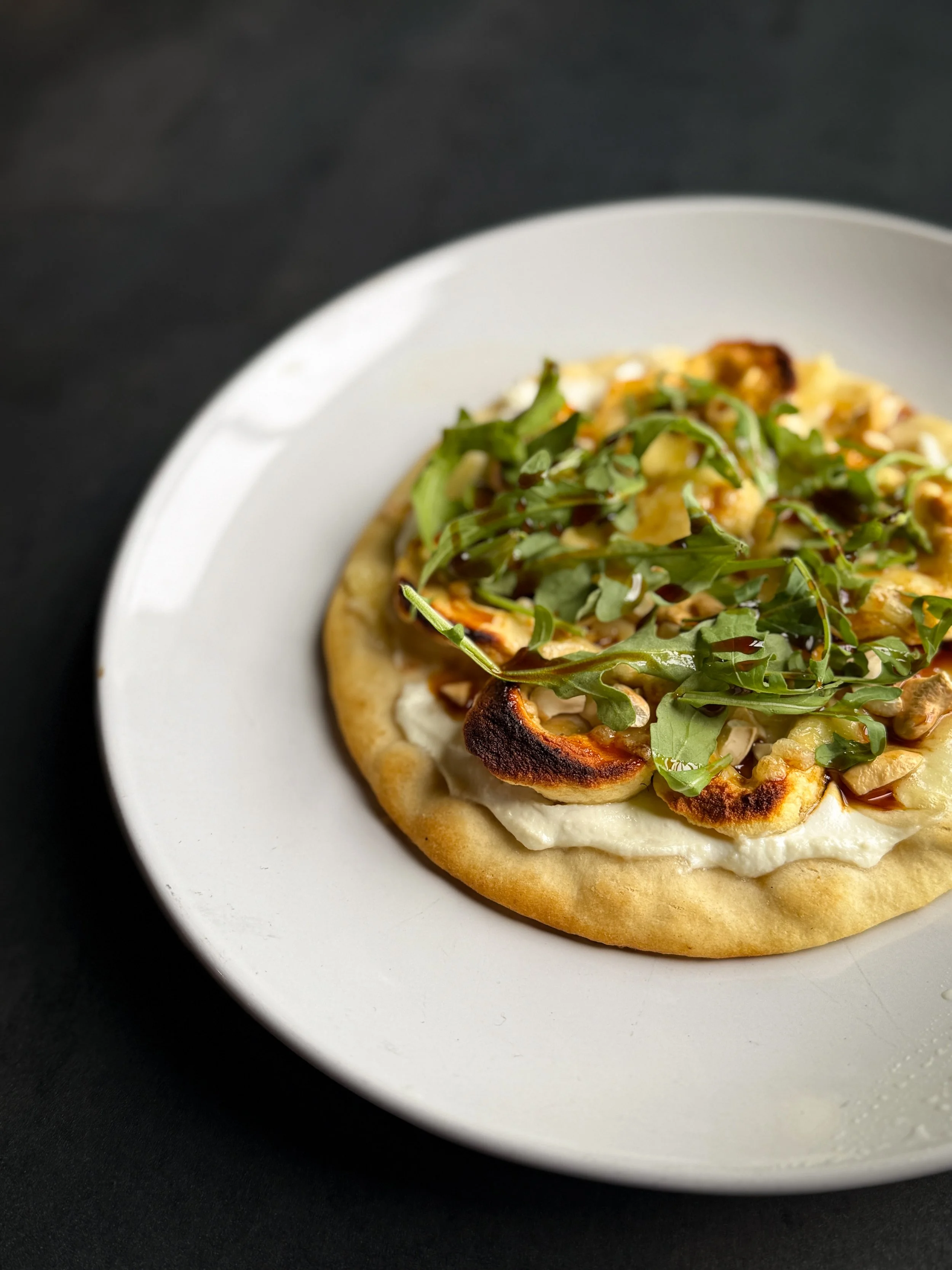 DRIED APPLE, RICOTTA, GRUYERE, CASHEWS, ARUGULA, APPLE BALSAMIC (ADD BACON $2)